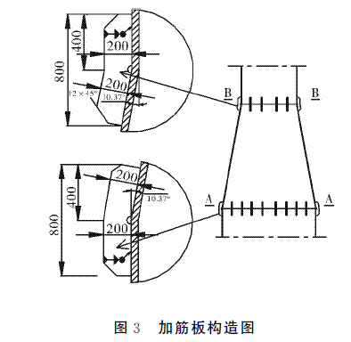 烟囱的过渡段连接处是结构薄弱部位,故在过渡段连接处焊接加筋板,对结构进行加强,结构示意图见图3,图中,A-A截面处均布20个,B-B截面均布12个,筋板厚度均为20mm。