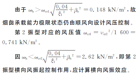 根据文献[5],当R e2>3.5×106 且结构顶部风速1.2vh>vcr2时,属跨临界强风共振,应考虑横风向引起的荷载效应(等效静荷载)。根据文献[6]需判断横向风振是否起控制作用。根据文献[6]的公式5.2.4.1和5.2.4.2,烟囱顶端设计风压值ωh=vh2/1 600=1.07(kN/m2),第1振型对应的风压值ωcr1=vcr12/1 600=0.042kN/m2。