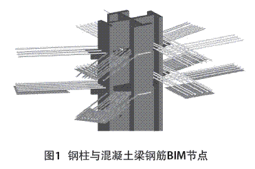 工程的结构形式为钢骨柱和混凝土梁组成的混合型结构,混凝土梁钢筋通过接驳器和钢柱牛腿与钢柱进行焊接锚固,部分钢筋采用穿越孔与钢柱腹板正交穿越。这种连接形式是该项目的最大特点,图1为用软件模拟后的效果。