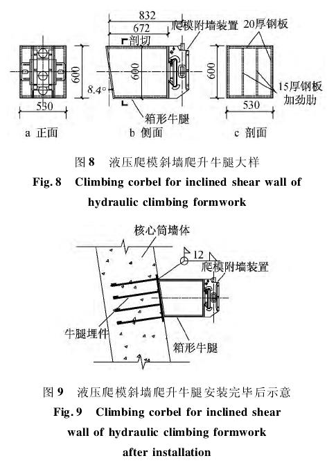 拆模后焊接液压爬模①号架体6 个斜墙爬升牛腿,同时安排施工人员错位绑扎另外3 面的42 层核心筒墙柱钢筋,待牛腿焊接完毕后,最后绑扎该面墙体钢筋。液压爬模斜墙爬升牛腿大样如图8 所示。焊接完毕后的液压爬模爬升牛腿如图9 所示。