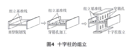 十字柱的组立时在其端头腹板上确立装配基准线,然后,以该装配基准线为基准加工穿筋孔(图3、图4)。焊缝采用CO2打底,小车式埋弧焊机盖面的焊接工艺,焊接参数严格按照合格的焊接工艺评定进行。为合理控制焊接过程中产生的变形,焊接顺序按图3、图4所示进行,并在焊接过程中加强检查,以便随时作出相应调整。
