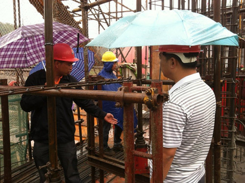 我公司吴贞诚经理(黑色衣服)向中核建设集团的刘经理讲解滑模施工工艺